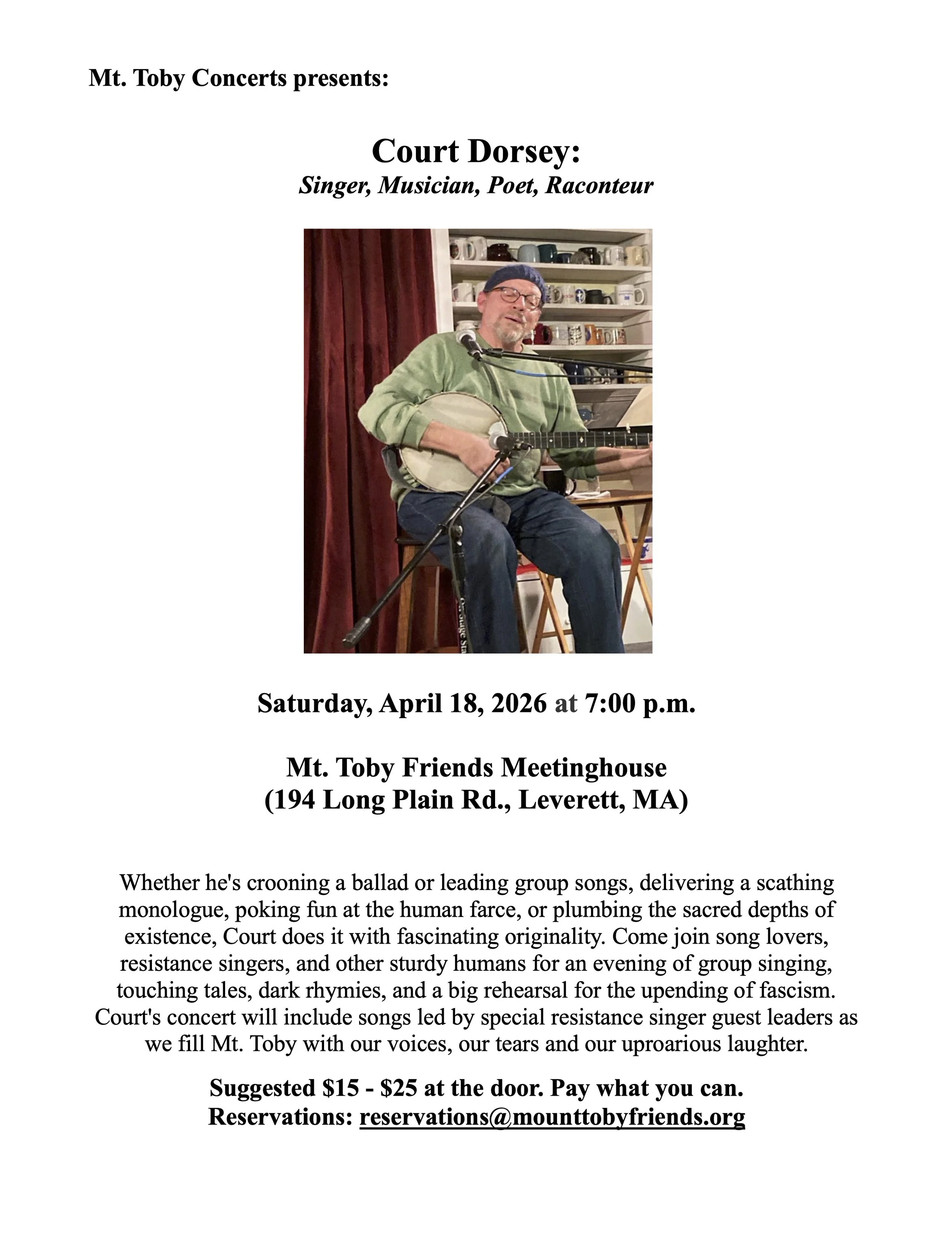 Come join song lovers, resistance singers, and other sturdy humans for an evening of group singing, touching tales, dark rhymies, and a big rehearsal for the upending of fascism. Court's concert will include songs led by special resistance singer guest leaders as we fill Mt. Toby with our voices, our tears and our uproarious laughter.